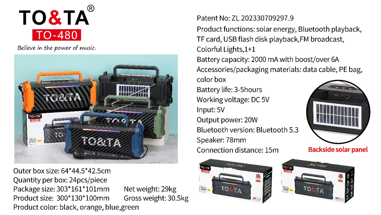 Product functions: solar energy, Bluetooth playback.TF card, USB flash disk playback,FM broadcast,Colorful Lights,1+1