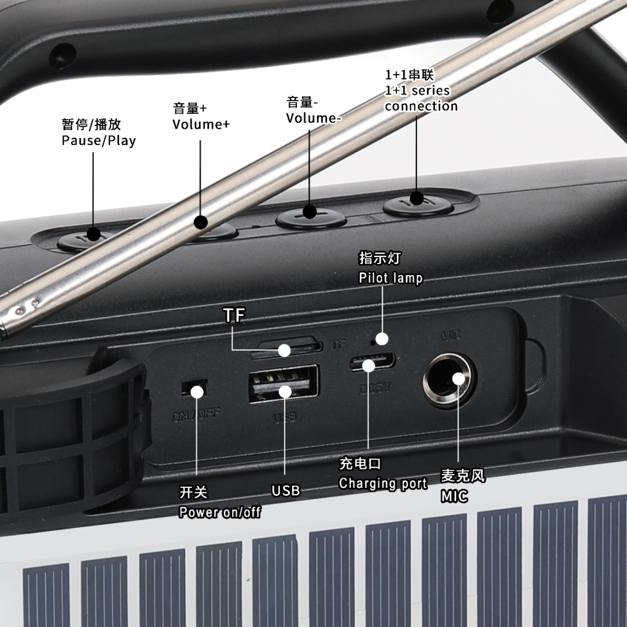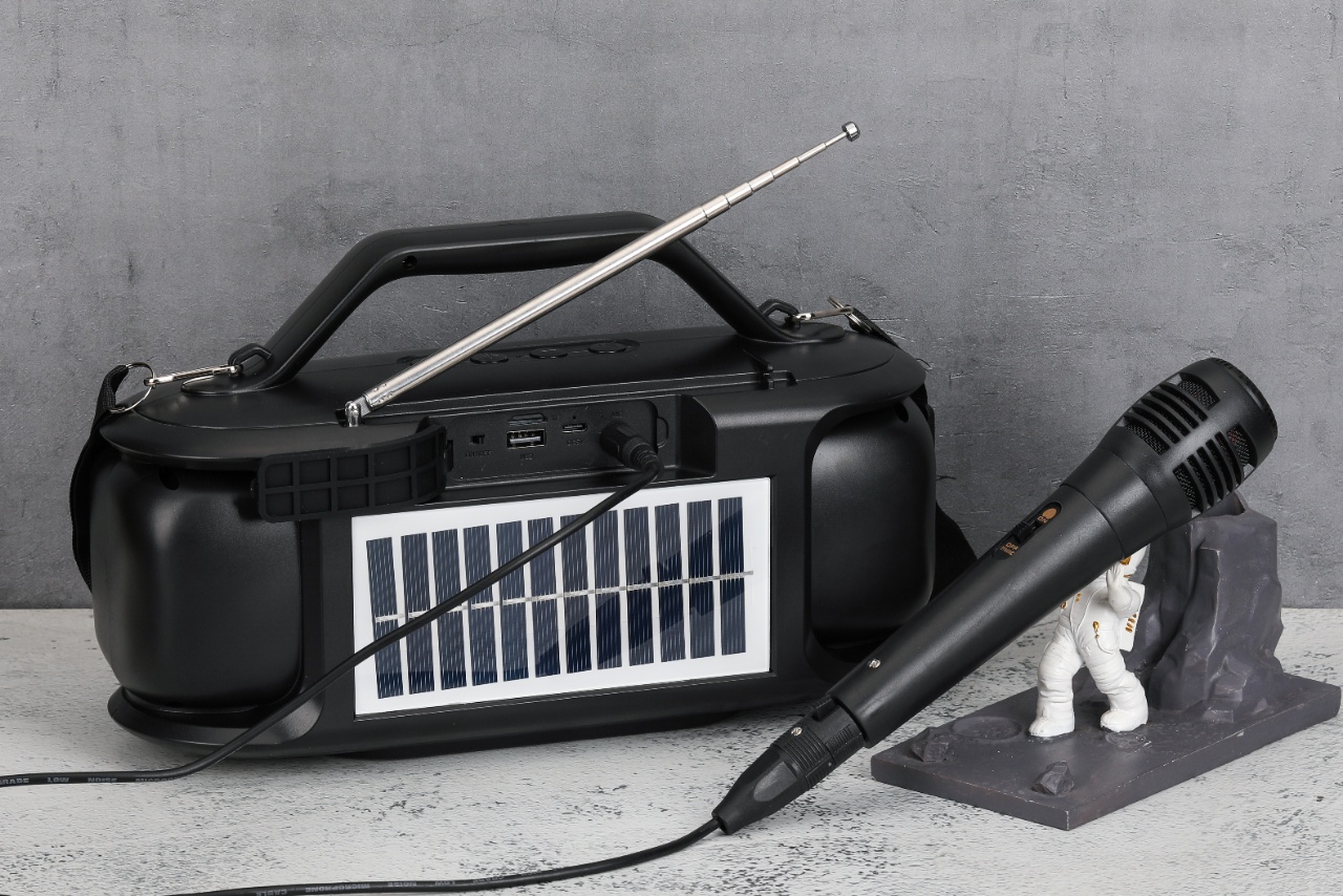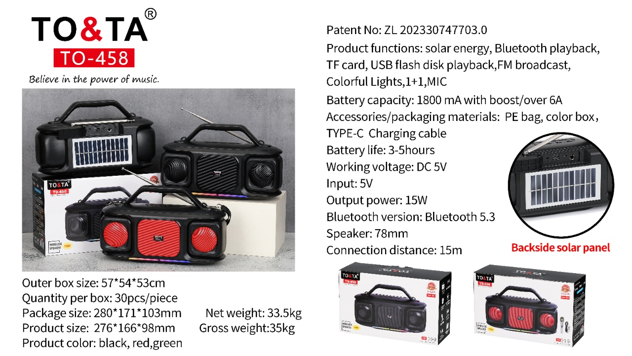 Product functions: solarenergy, Bluetooth playback.TF card,USB flash disk playback,FM broadcast,Colorful Lights,1+1,MIC