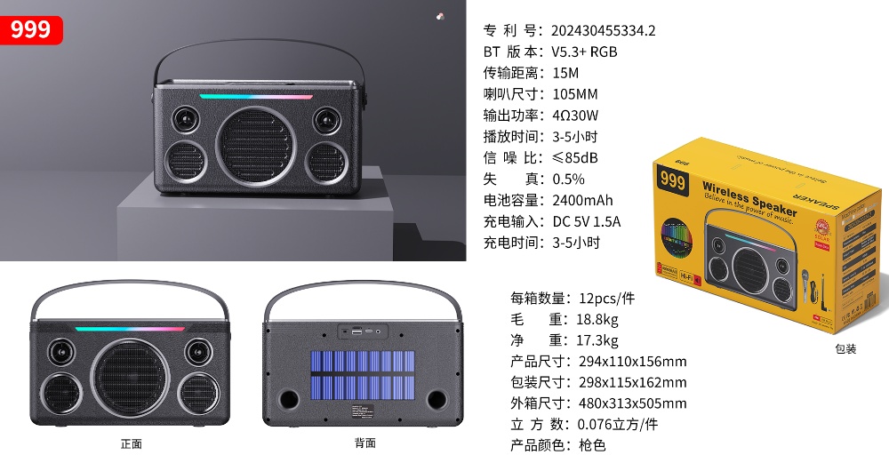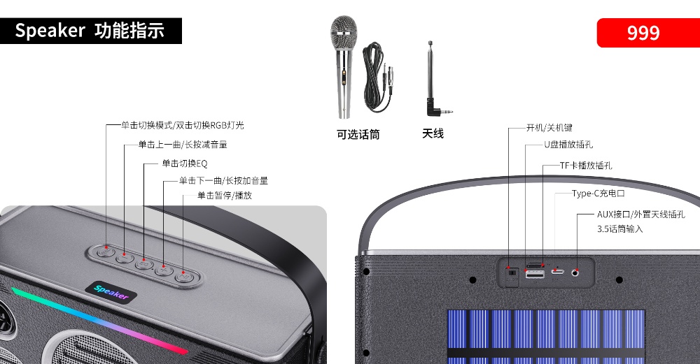 Product functions: solarenergy, Bluetooth playback.TF card,USB flash disk playback,FM broadcast,Colorful Lights,1+1,MIC